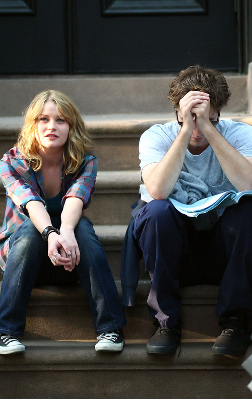 Emilie de Ravin and Robert Pattinson sit on the steps of a brownstone together on the Brooklyn set of ‘Remember Me’. Robert can be seen intently studying his lines.