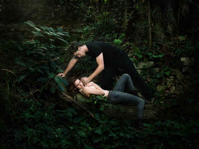 ca. 2008 — Styling: Emma Trask; Hair: Campbell McAuley; Make-up: Jillian Dempsey; Grooming: Kela Wong; Pattinson’s t-shirt: Dylan & George; Jeans: J.Lindberg; Stewart’s tank: Bao Tranchi; Jeans: J. Brand — Image by © James White/Corbis Outline
