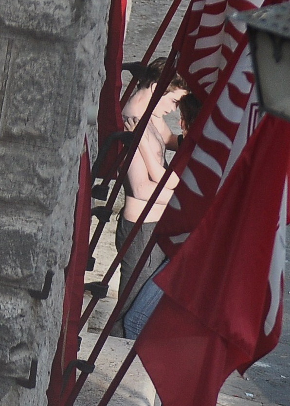 LarisaMartinas193©kikapress.com *** Local Caption *** (KIKA) – MONTEPULCIANO, 27 MAG – EXCLUSIVE – Kristen Stewart and Robert Pattinson on the set of the Twilight sequel, New Moon. Pattinson without shirt hugs and kisses Stewart on the last scene of the movie.