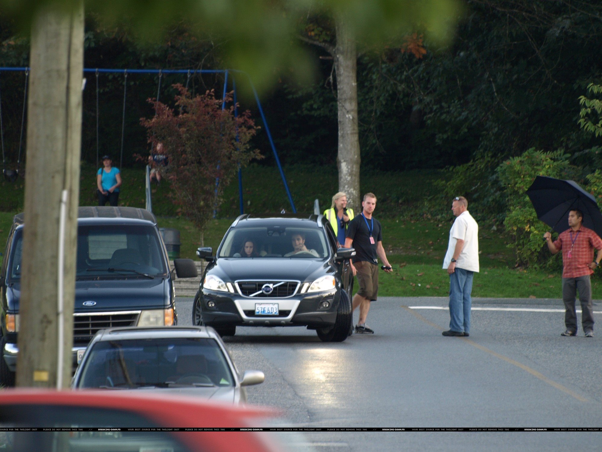 Robert Pattinson and Kristen Stewart filming on the set of the Forks police station in Vancouver, Canada.