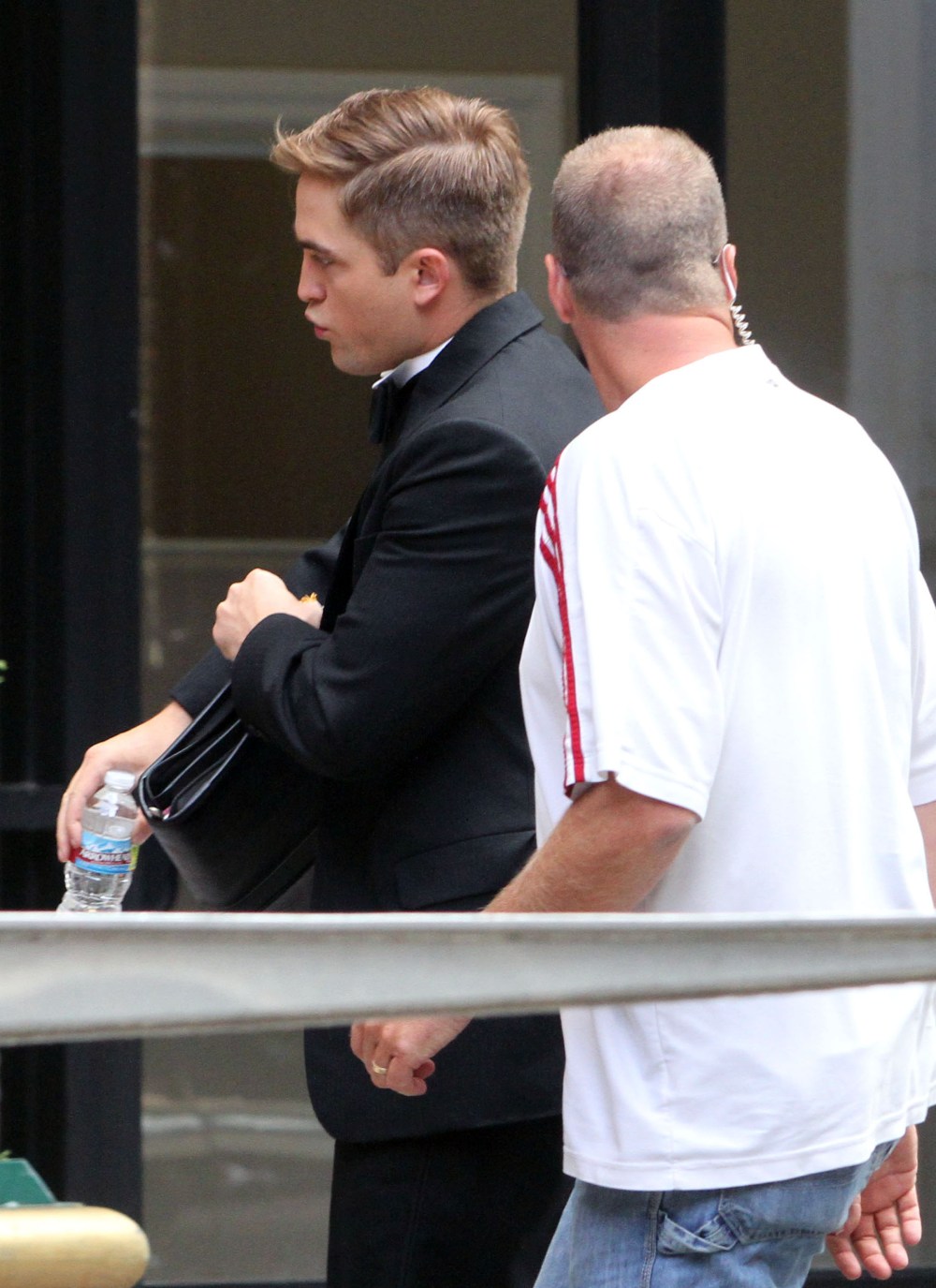 #5309128 Actor Robert Pattinson continues work on the set of “Water For Elephants” in the downtown area of Los Angeles, CA on July 1, 2010. A few bodyguards who blocked the actor from the fans and paparazzi rushed Robert into the location. Robert had his hair slicked back and was wearing a suit, what could this scene be?