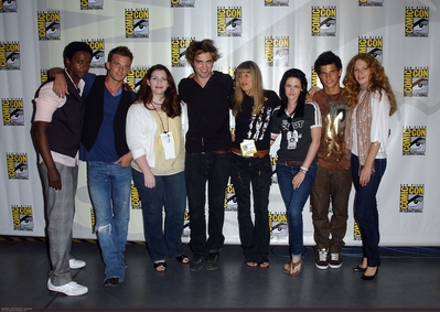 SAN DIEGO – JULY 24: Actor Edi Gathegi, actor Cam Gigandet, writer Stephenie Meyer, actor Robert Pattinson, director Catherine Hardwicke, actress Kristen Stewart, actor Taylor Lautner and actress Rachelle Lefevre attend the 2008 Comic-Con International on July 24, 2008 at the San Diego Convention Center in San Diego, California. (Photo by Albert Ortega/WireImage)