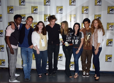 SAN DIEGO – JULY 24: Actor Edi Gathegi, actor Cam Gigandet, writer Stephenie Meyer, actor Robert Pattinson, director Catherine Hardwicke, actress Kristen Stewart, actor Taylor Lautner and actress Rachelle Lefevre attend the 2008 Comic-Con International on July 24, 2008 at the San Diego Convention Center in San Diego, California. (Photo by Albert Ortega/WireImage)
