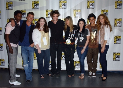 SAN DIEGO – JULY 24: Actor Edi Gathegi, actor Cam Gigandet, writer Stephenie Meyer, actor Robert Pattinson, director Catherine Hardwicke, actress Kristen Stewart, actor Taylor Lautner and actress Rachelle Lefevre attend the 2008 Comic-Con International on July 24, 2008 at the San Diego Convention Center in San Diego, California. (Photo by Albert Ortega/WireImage)