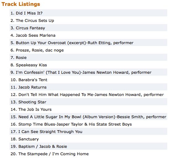 The Water for Elephants soundtrack has been revealed. Please see the song list below.