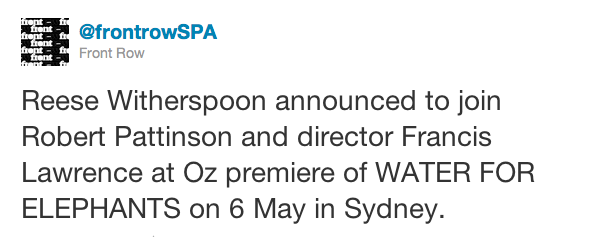 Water for Elephants Sydney premiere: Reese Witherspoon to join Robert Pattinson and Francis Lawrence 2 comments