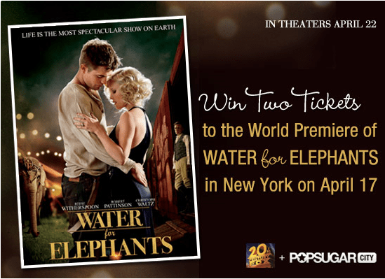 Love Robert Pattinson and Reese Witherspoon? Enter PopSugar NYC’s giveaway, and you could attend the world premiere of Water For Elephants on April 17. One lucky winner will receive two tickets to the New York premiere.