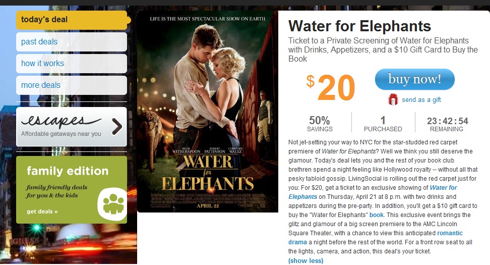 Living Social has a deal up today where you can purchase tickets to a private screening of Water for Elephants in New York City on April 21st. The tickets cost 20$ and includes drinks, appetizers and a 10$ gift card to purchase the book! You have 24 hours to buy them.