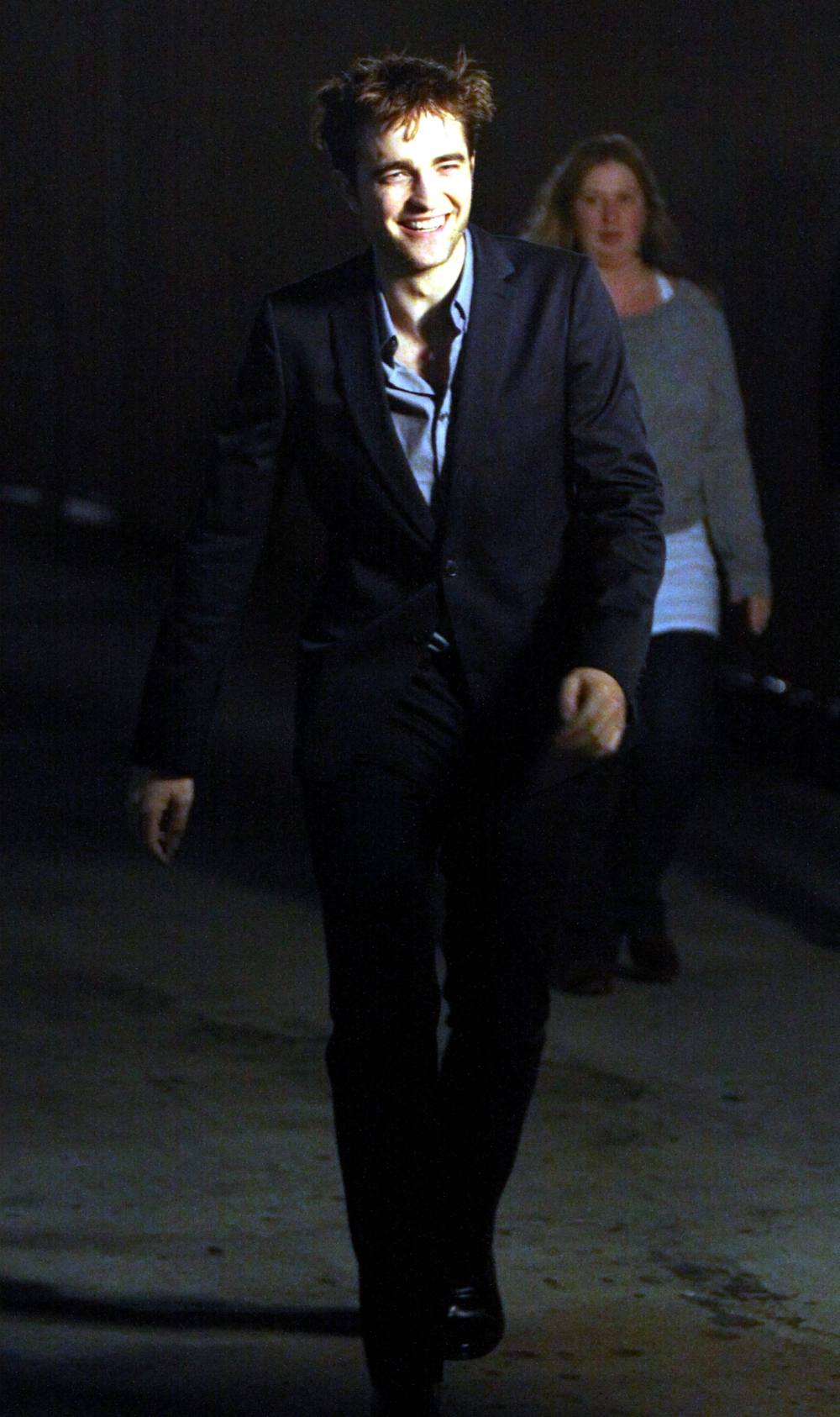 MAVRIXONLINE.COM – DAILY MAIL ONLINE OUT – Wearing a black suit and grey shirt, “Twilight Saga” star Robert Pattinson looks to be in very high spirits as he leaves the “Jimmy Kimmel Live” studios after a taping of the show. Pattinson, who is currently promoting his new film “Water For Elephants,” signed autographs and posed for photos with fans. Los Angeles, CA. 4/20/11.