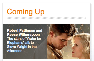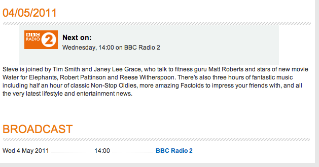 Robert Pattinson and Reese Witherspoon will be interviewed on may 4th about Water for Elephants on ‘Steve Wright In The Afternoon’ on BBC Radio 2 (UK). The program starts at 2:00 PM local time (9:00 AM ET, 3 :00 PM CET). Click here to go the site and a link to listen (might only work in the UK).