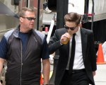 An attention-shy Pattinson had his Lunch delivered to him in his deluxe Trailer from Craft Services and was seen with a bottle of Nestea Iced Green Tea in his hand walking into his Make-up Trailer for a touch-up. Noticing Paparazzi and Fans trying to snap away, he at one point tried hiding behind his Handler, before toughening-up and braving the Cameras. One Paparazzi got in a little too close and was warned, “You better stay back or I’m gonna make sure everyone else gets their Photos except you!”. Ouch.