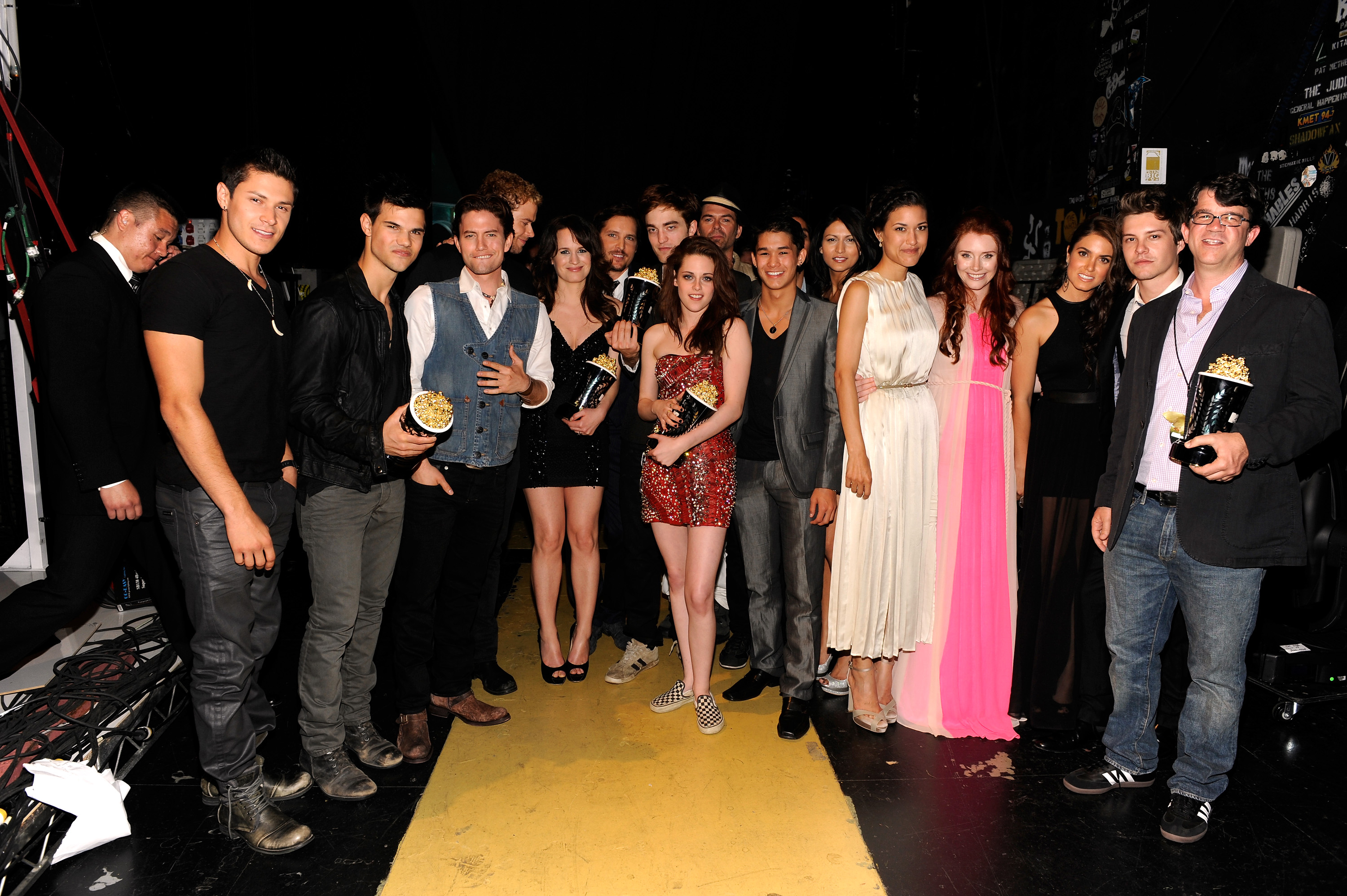 Here are 2 New HQ Pics of Robert Pattinson, Kristen Stewart, Taylor Lautner, Peter Facinelli, Elizabeth Reaser and Kellan Lutz at the MTV Movie Awards.
