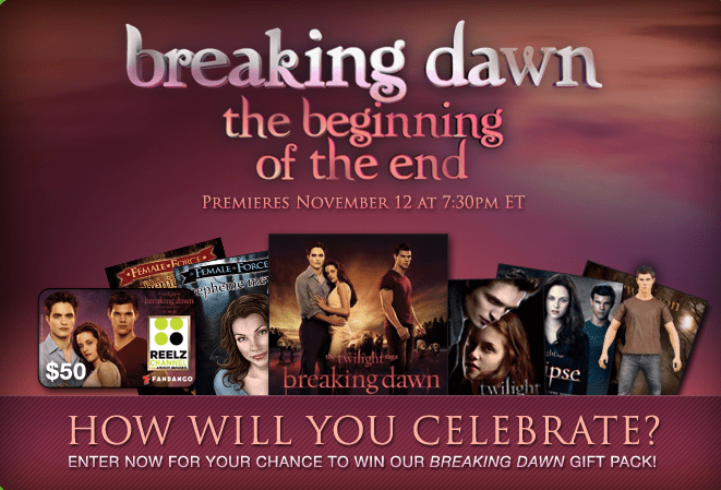 From Reelz: This is the movie every fan has been waiting for. In our upcoming Breaking Dawn: The Beginning of the End special, we’ll look back at the series, its stars, and Twilight‘s phenomenal fanbase. In anticipation, we want to know how you plan to celebrate the release of the first Breaking Dawn movie.Tell us your celebration plans in 150 words or less for a chance to win our grand prize gift pack: