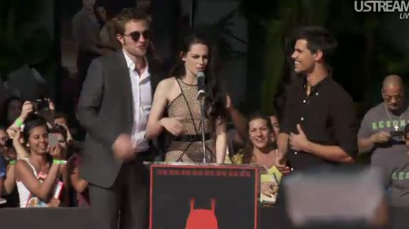 Screencaps of Robert Pattinson, Kristen Stewart and Taylor Lautner at the Twilight Handprint Ceremony » fdr   Leave a comment