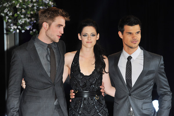 LONDON, ENGLAND – NOVEMBER 16: Actors (L-R) Robert Pattinson, Kristen Stewart and Taylor Lautner attend ‘The Twilight Saga: Breaking Dawn Part 1’ UK Premiere, at Westfield Stratford City on November 16, 2011 in London, England. (Photo by Jon Furniss/WireImage) *** Local Caption *** Robert Pattinson;Kristen Stewart;Taylor Lautner;