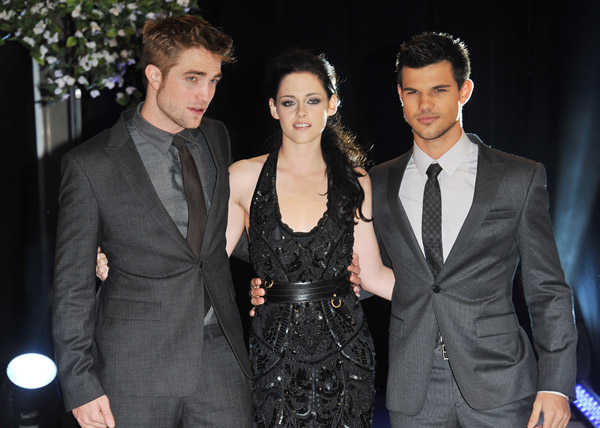 LONDON, ENGLAND – NOVEMBER 16: Actors (L-R) Robert Pattinson, Kristen Stewart and Taylor Lautner attend ‘The Twilight Saga: Breaking Dawn Part 1’ UK Premiere, at Westfield Stratford City on November 16, 2011 in London, England. (Photo by Jon Furniss/WireImage) *** Local Caption *** Robert Pattinson;Kristen Stewart;Taylor Lautner;