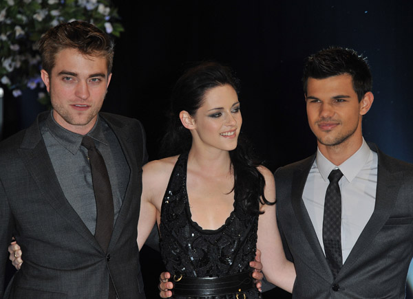 LONDON, ENGLAND – NOVEMBER 16: Actors (L-R) Robert Pattinson, Kristen Stewart and Taylor Lautner attend ‘The Twilight Saga: Breaking Dawn Part 1’ UK Premiere, at Westfield Stratford City on November 16, 2011 in London, England. (Photo by Jon Furniss/WireImage) *** Local Caption *** Robert Pattinson;Kristen Stewart;Taylor Lautner;