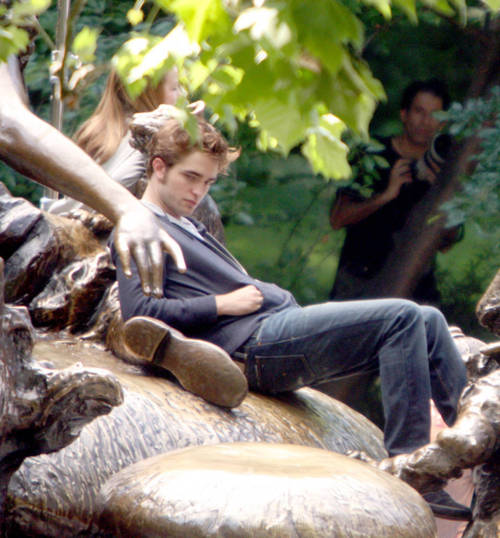 ROBERT PATTINSON mit seinem Filmkind auf Märchen – Bronzefiguren im Central Park / June 30, 2009: Robert Pattinson on the set of ‘Remember Me’ which is currently filming in New York City. Credit: Roger Wong/INFphoto.com Ref.: infusny-146