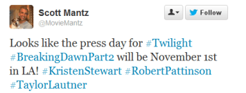 According to Access Hollywood’s Scott Mantz, ‘Breaking Dawn – Part 2’ press day in LA will be/start on November 1st.
