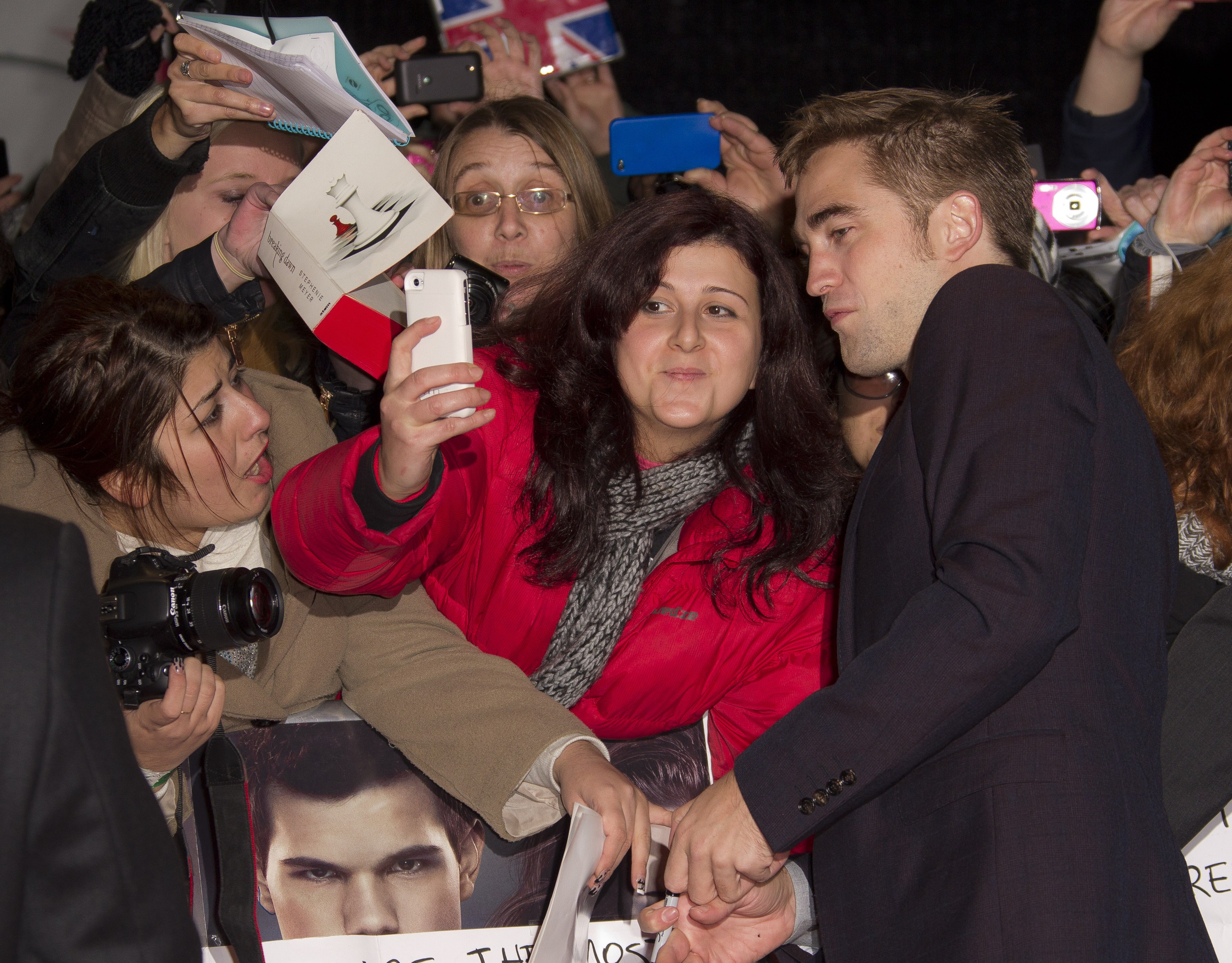 Robert Pattinson, who plays Edward Cullen, poses with fans as he arrives for the European Premiere of The Twilight Saga: Breaking Dawn Part 2, the final film in the series, in Leicester Square, central London, Wednesday, Nov. 14, 2012. (Photo by Joel Ryan/Invision/AP)