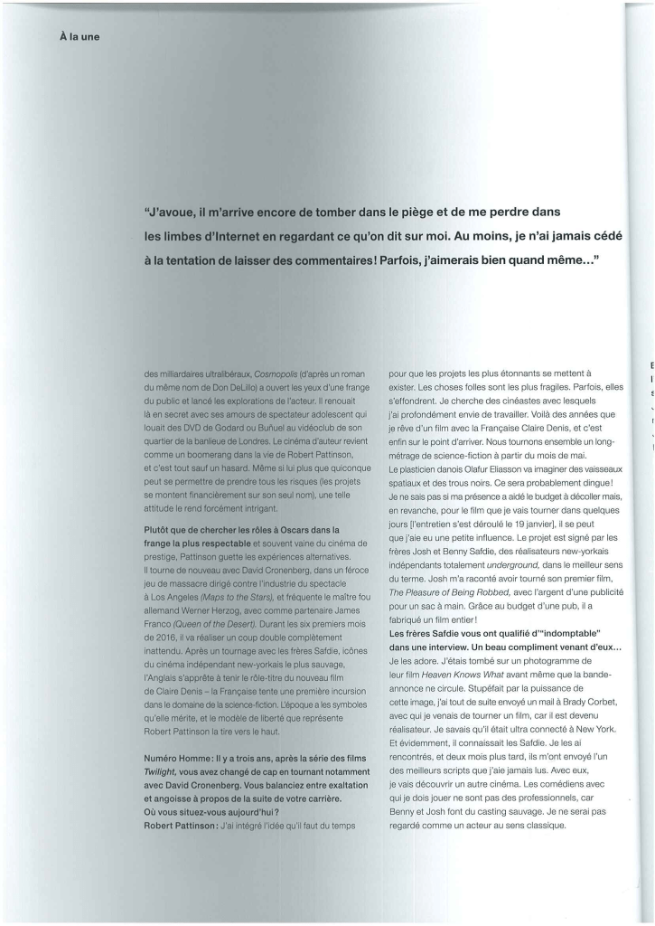 Here are scans of Robert Pattinson’s photoshoot and interview in ‘Numéro Homme’