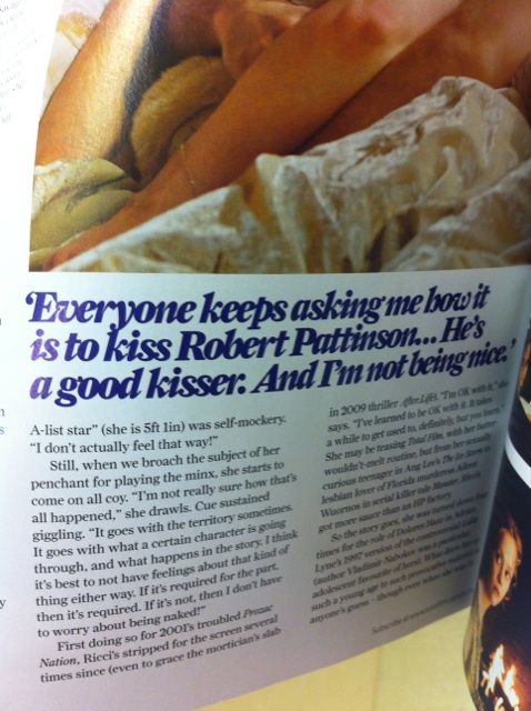 There was also Pattinson. Locking lips and limbs with the Twilight star in a series of saucy boudoir scenes, Ricci gets more R-Pattz ass than Bella Swan ever has. So come on, Christina, kiss and tell… “Everyone keeps asking me how it is to kiss Robert,” She says, “He’s a good kisser. And I’m not being nice. It’s just like that.”
